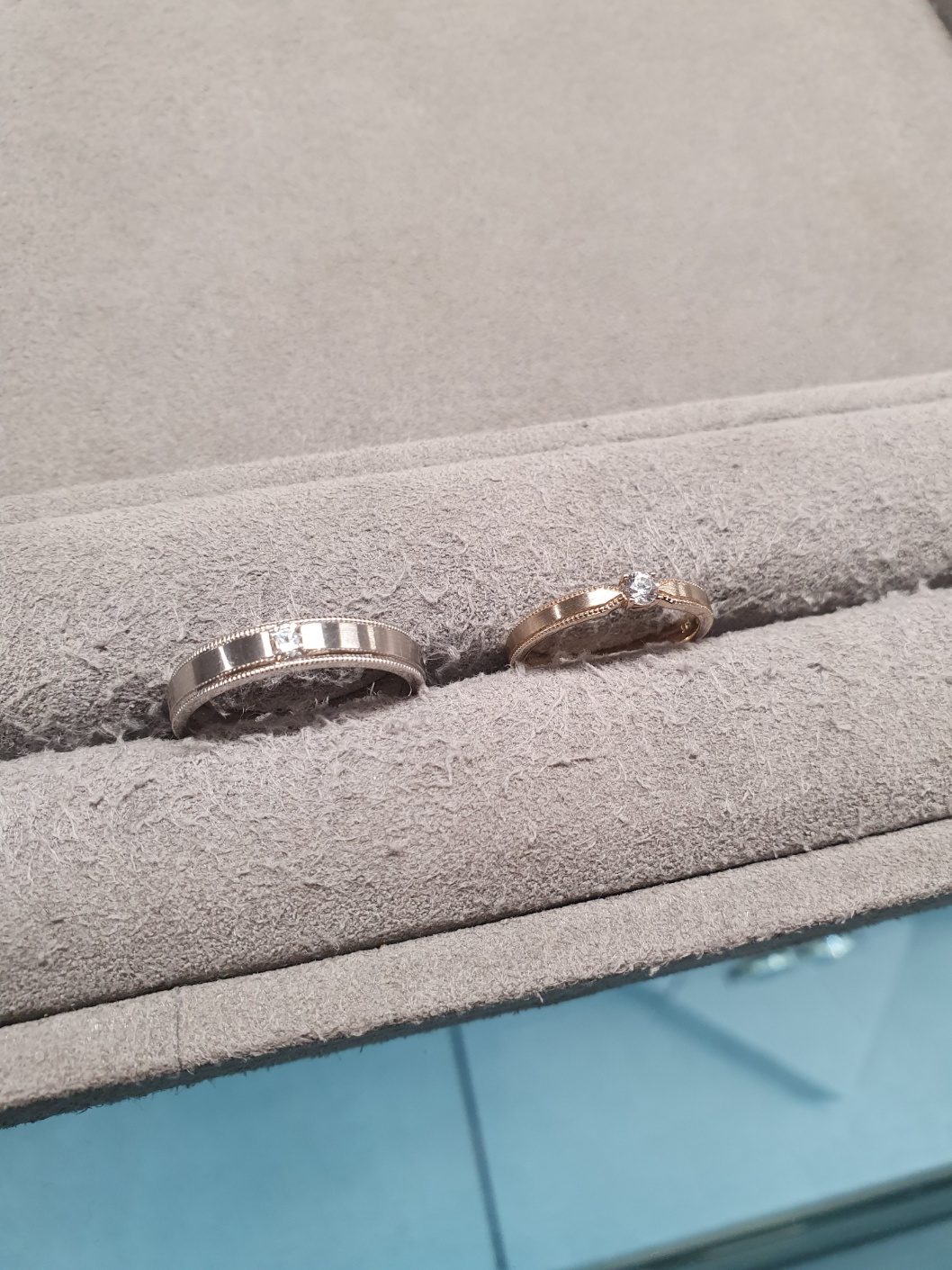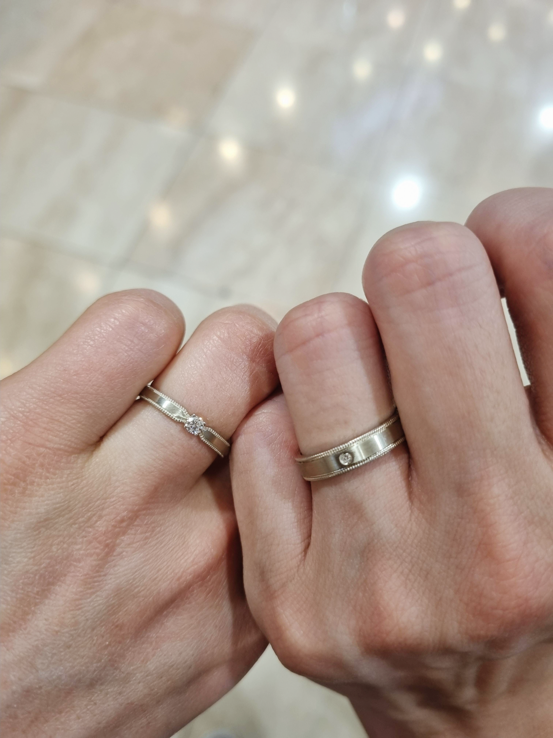 스톤콧에서 계약을 하게 된 가장 중요한 이유는 디자인이었다.👑 이미 다른 가게를 돌며 어느 정도 내 취향을 파악한 상태인데 스톤콧에서 딱 껴본 디자인이 너무 마음에 들어 끼자마자 "이걸로 계약할까?🤩"라고 했다. (내가 이런 적이 없어서 남편이 깜짝 놀랐다) 내가 마음에 드는 걸 빨리 찾아 상담이 빨리 끝난 것도 있을 것이다. 약간 앤틱 한 느낌이 드는 내추럴 골드색으로 했는데 남 여 피부톤에 모두 잘 어울리고 엄청 화려하지는 않지만 귀여운 다이아 포인트가 있는 반지였다.